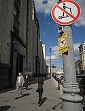Жанровая фотография. Улица Охотный ряд. Здание Государственной думы России. Запрещающий знак на столбе о использовании электросамокатов и бесполетной зоны.
