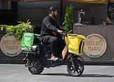 Жанровая фотография. Курьер сервисов доставки еды "Купер" (Сбермаркет) и "Яндекс" едет на велосипеде у веранды итальянского ресторана "Остерио Марио".
