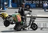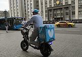 Жанровая фотография. Виды Москвы. Курьер сервиса доставки "Вкус вилл" едет на мопеде по улице.