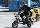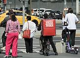 Жанровая фотография. Курьер сервис доставки еды "Купер" (Сбермаркет) на арендном электросамокате едет по пешеходному переходу в центре города.