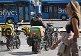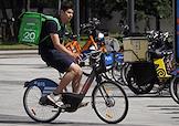 Жанровая фотография. Виды Москвы. Курьер сервиса доставки "Купер" (Сбермаркет) на велосипеде на улице.