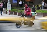 Жанровая фотография. Виды Москвы. Курьер сервиса доставки "Купер" (Сбермаркет) на велосипеде едет по улице.