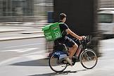 Жанровая фотография. Курьер сервисов доставки еды "Купер" (Сбермаркет) и "Яндекс" едет на велосипеде.