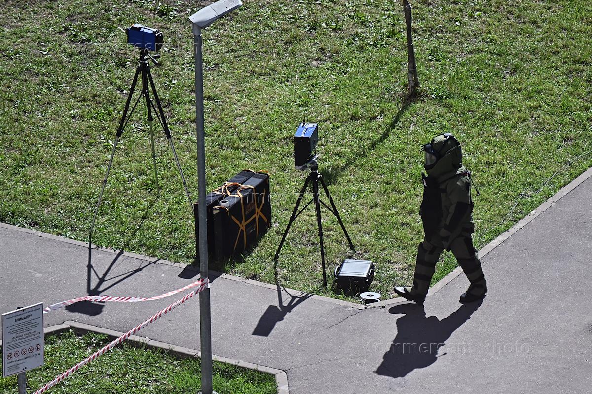 Consequences of an explosion of a Toyota Land Cruiser in a parking lot near a residential building on Sinyavinskaya Street. An explosives technician near the scene of the incident.