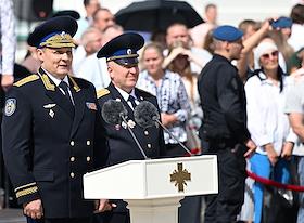 Церемония приведения к военной присяге молодого пополнения Президентского полка Службы коменданта Московского Кремля Федеральной службы охраны России (СКМК ФСО) призыва "Весна-2024" на Соборной площади Московского Кремля. Комендант Московского Кремля Сергей Удовенко (слева) на церемонии.