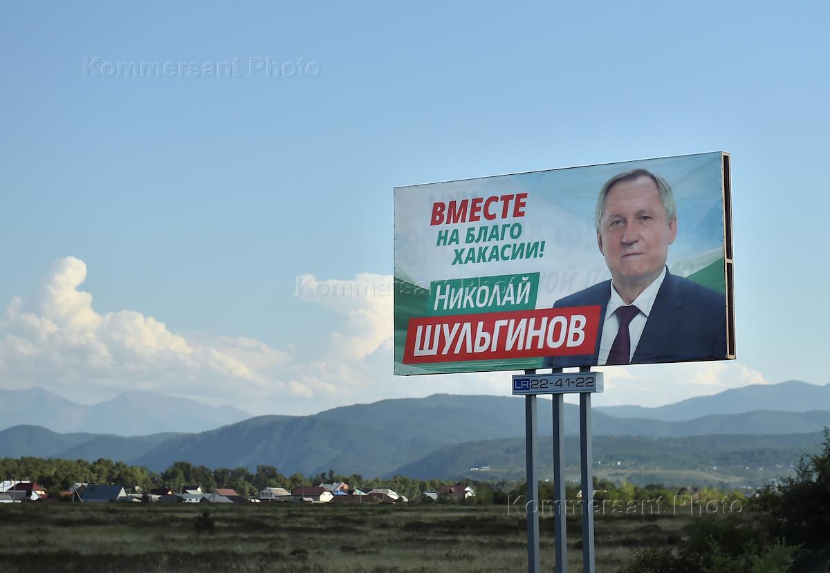 Жанровые фотографии. Предвыборная агитация в Республике Хакасия. Предвыборная агитация о дополнительных выборах депутатов Государственной Думы Федерального Собрания Российской Федерации восьмого созыва по одномандатному избирательному округу №35 (Республика Хакасия). Плакат кандидата Николая Шульгинова на улице города.