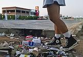 Жанровая фотография. Отдых в городе-курорте Шарм-эль-Шейх на побережье Красного моря Египетской ривьеры. Мусор на пляже и ресторан сети ресторанов быстрого питания Мак Дональдс.