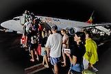 Жанровая фотография. Отдых в городе-курорте Шарм-эль-Шейх на побережье Красного моря Египетской ривьеры. Отдыхающие во время посадки в самолет авиакомпании Red Sea Airlines в Международном аэропорте Шарм-эш-Шейх.