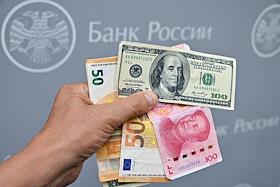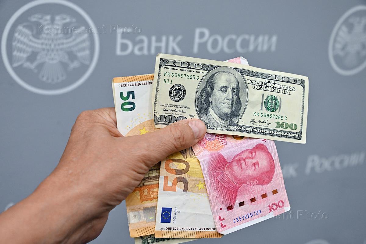 Пресс-конференция по итогам заседания Совета директоров Центрального Банка (ЦБ) России по вопросам денежно-кредитной политики в пресс-центре ЦБ России. Жанровая фотография. Купюры доллара, евро и юаня в руке на фоне логотипа ЦБ России.