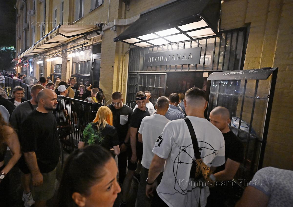 Вечеринка-закрытие ночного клуба "Пропаганда" в Большом Златоустинском переулке. Посетители у входа в клуб.