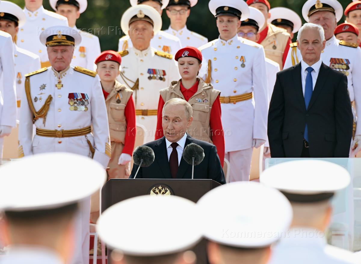 Рабочая поездка президента России Владимира Путина в Санкт-Петербург. Празднование Дня Военно-морского флота (ВМФ) России. Министр обороны России Андрей Белоусов (второй слева), главнокомандующий ВМФ России Александр Моисеев (третий справа) и президент России Владимир Путин (в центре) во время Главного Военно-морского парада.