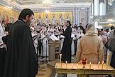 День Крещения Руси и день памяти святого равноапостольного князя Владимира. Торжества по случаю престольного праздника Свято-Владимирского Херсонесского мужского монастыря и открытия музейно-храмового комплекса "Новый Херсонес". Архиерейская Божественная Литургия в Свято-Владимирском соборе. Слева направо: митрополит Волгоградский и Камышинский Феодор, митрополит Платон и викарий Симферопольской епархии, епископ Ялтинский Нестор во время проскомидии.