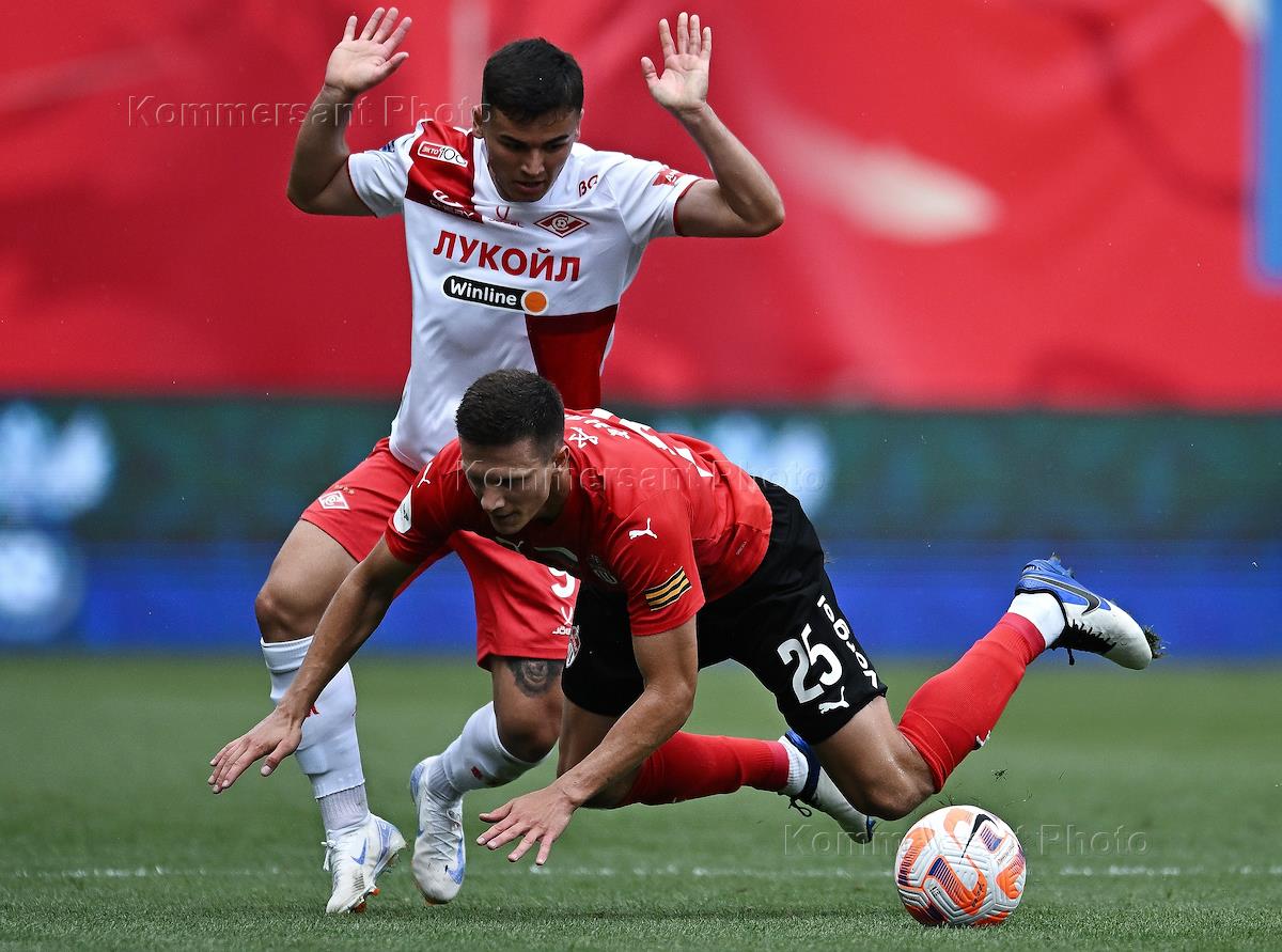Российская Премьер-Лига (РПЛ). МИР- Чемпионат России по футболу 2024/2025. 2-й тур. Матч между командами "Химки" (Химки) - "Спартак" (Москва) на стадионе "Арена Химки". Игрок команды "Спартак" Михаил Игнатов (в центре) во время матча.