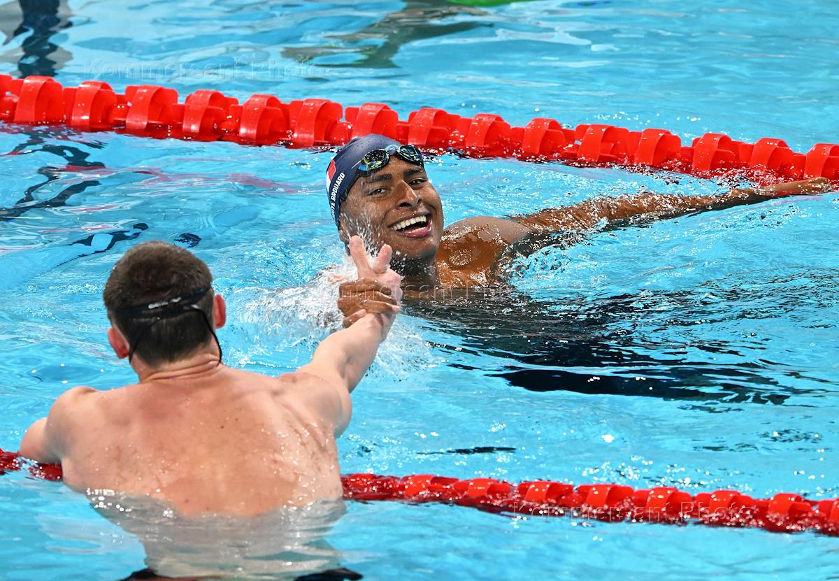XXXIII Летние Олимпийские игры в Париже. Соревнования по плаванию на стадионе "Пари Ла Дефанс Арена". Мужчины. 100 м на спине. 1/2 финала. Французский спортсмен Йоанн Ндойе-Бруар (справа) во время соревнований.