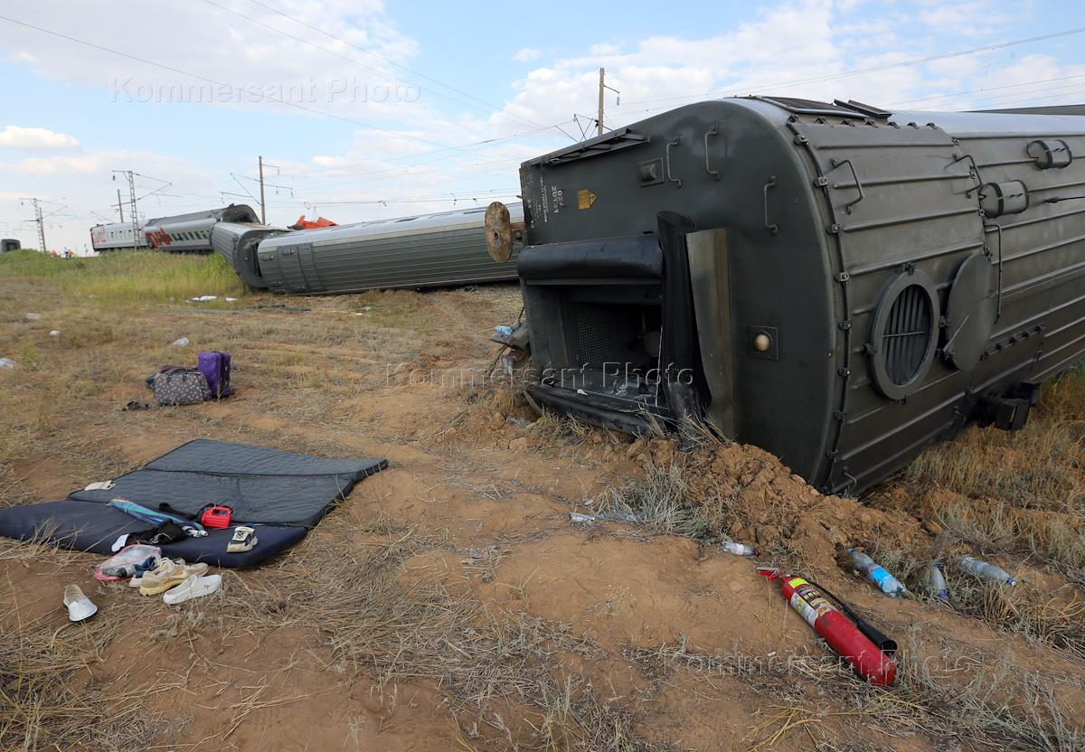 Вагоны пассажирского поезда "Казань-Адлер", сошедшего с рельсов в Котельниковском районе Волгоградской области из-за столкновения с автомобилем "КамАЗ" на железнодорожном переезде.
