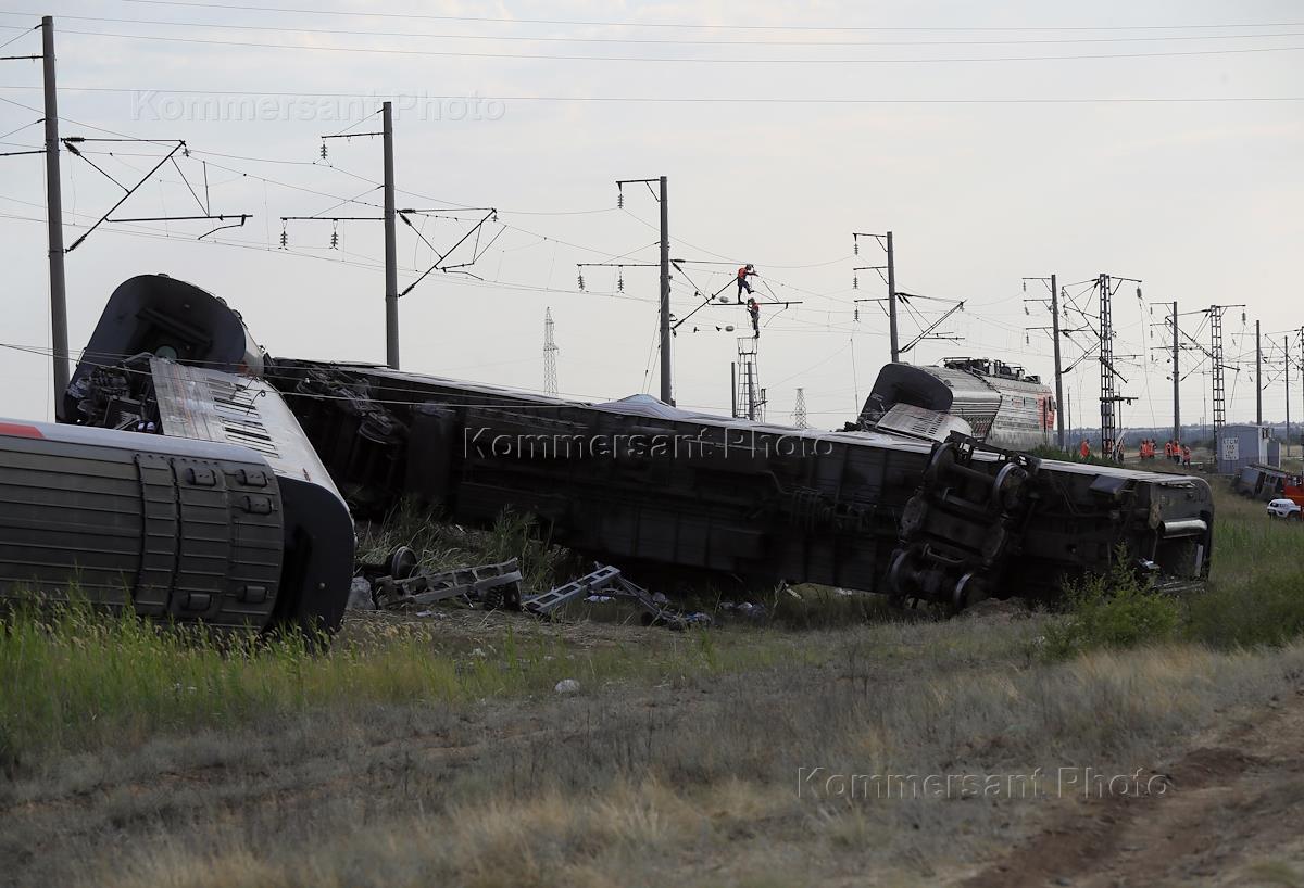 Устранение последствий схода с рельсов пассажирского поезда "Казань-Адлер" в Котельниковском районе Волгоградской области из-за столкновения с автомобилем "КамАЗ" на железнодорожном переезде.