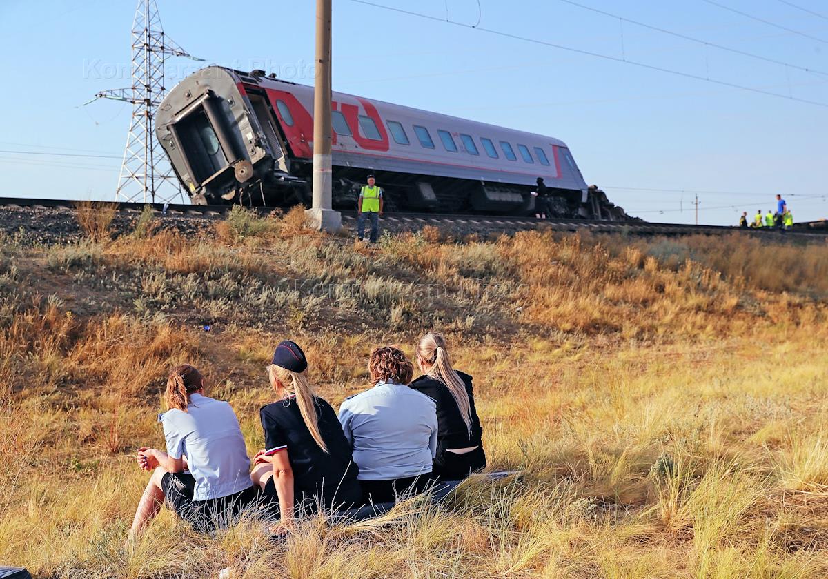 Cars of the Kazan-Adler passenger train, which derailed in the Kotelnikovsky district of the Volgograd region due to a collision with a KamAZ vehicle at a railway crossing. Passengers at the scene.