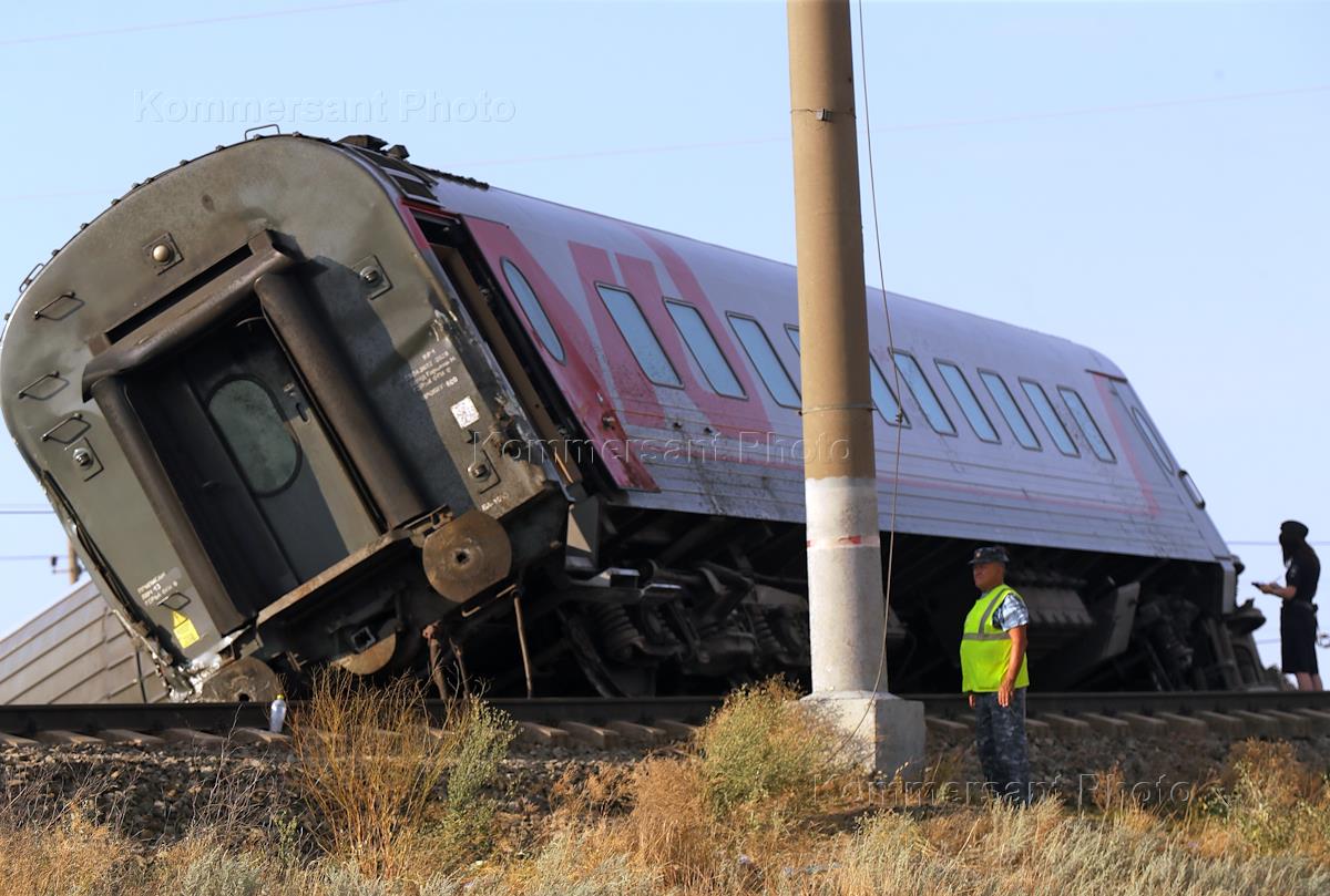 Вагоны пассажирского поезда "Казань-Адлер", сошедшего с рельсов в Котельниковском районе Волгоградской области из-за столкновения с автомобилем "КамАЗ" на железнодорожном переезде.