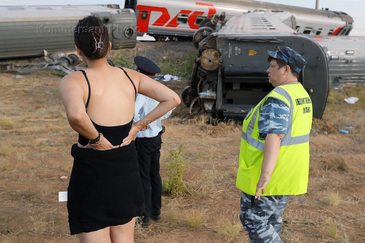 Вагоны пассажирского поезда "Казань-Адлер", сошедшего с рельсов в Котельниковском районе Волгоградской области из-за столкновения с автомобилем "КамАЗ" на железнодорожном переезде. Автомобиль и сотрудники МЧС России во время устранения последствий крушения поезда.