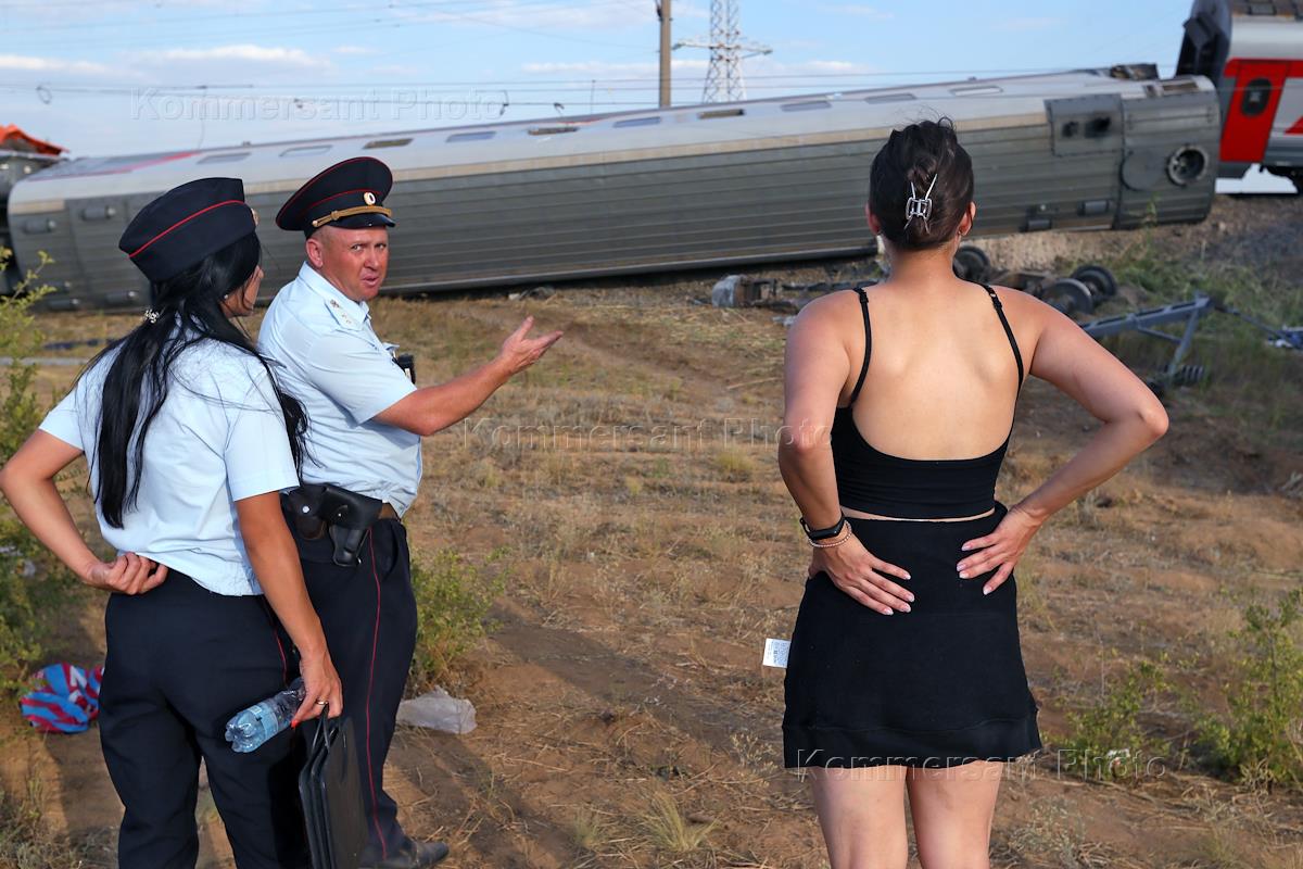 Вагоны пассажирского поезда "Казань-Адлер", сошедшего с рельсов в Котельниковском районе Волгоградской области из-за столкновения с автомобилем "КамАЗ" на железнодорожном переезде. Автомобиль и сотрудники МЧС России во время устранения последствий крушения поезда.