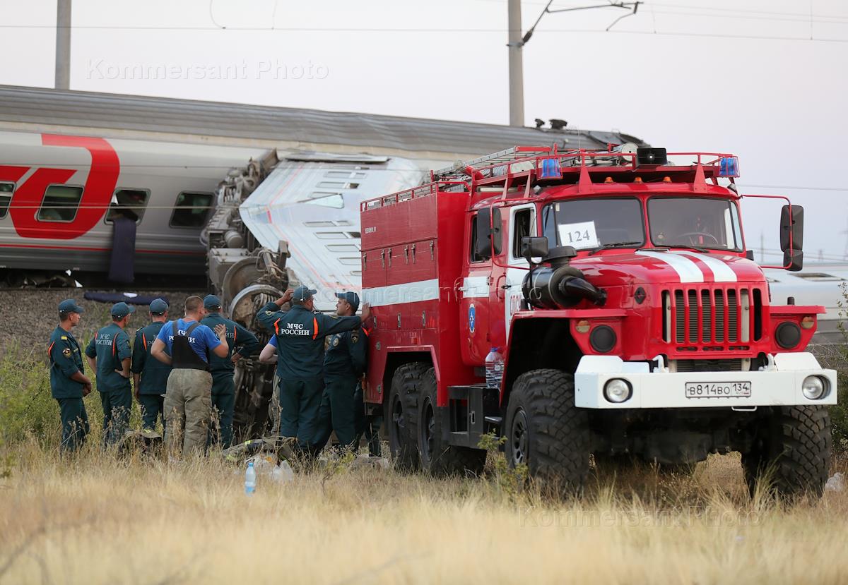 Cars of the Kazan-Adler passenger train, which derailed in the Kotelnikovsky district of the Volgograd region due to a collision with a KamAZ vehicle at a railway crossing. A car and employees of the Russian Ministry of Emergency Situations during the elimination of the consequences of a train crash.
