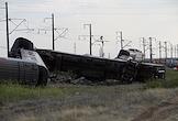 Cars of the Kazan-Adler passenger train, which derailed in the Kotelnikovsky district of the Volgograd region due to a collision with a KamAZ vehicle at a railway crossing.