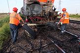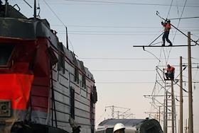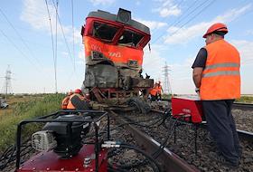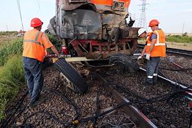 Workers during the elimination of the consequences of the derailment of the Kazan-Adler passenger train in the Kotelnikovsky district of the Volgograd region due to a collision with a KamAZ vehicle at a railway crossing.