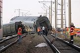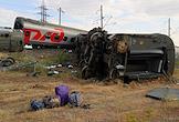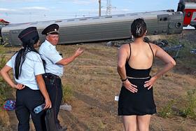 Consequences of the derailment of the Kazan-Adler passenger train in the Kotelnikovsky district of the Volgograd region due to a collision with a KamAZ vehicle at a railway crossing. A police car is at the scene.