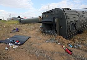Consequences of the derailment of the Kazan-Adler passenger train in the Kotelnikovsky district of the Volgograd region due to a collision with a KamAZ vehicle at a railway crossing. The cab of a KamAZ vehicle at the scene of the incident.