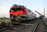 Elimination of the consequences of the derailment of the Kazan-Adler passenger train in the Kotelnikovsky district of the Volgograd region due to a collision with a KamAZ vehicle at a railway crossing. Lifting a carriage from the rails.