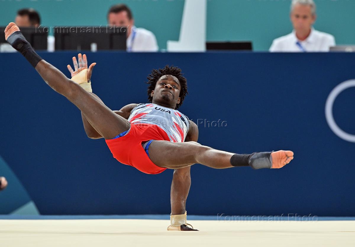 XXXIII Summer Olympic Games in Paris. Men's team all-around artistic gymnastics. Final at Arena Bercy. American gymnast Frederic Richard during a performance.
