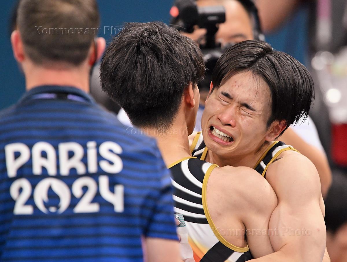 XXXIII Summer Olympic Games in Paris. Men's team all-around artistic gymnastics. Final at Arena Bercy. Japanese gymnast Shinnosuke Oka (center) after the end of the competition.