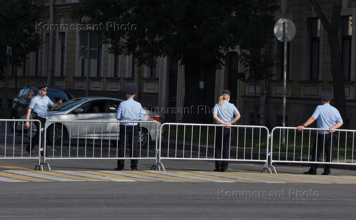 День Военно-морского флоата (ВМФ). Праздничные мероприятия в Санкт-Петербурге. Жанровая фотография. Перекрытие улиц города. Сотрудники полиции у ограждений.
