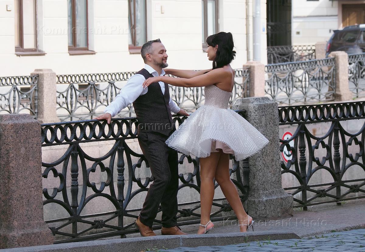 Views of St. Petersburg. Genre photography. The bride and groom on the embankment during a wedding photo shoot.