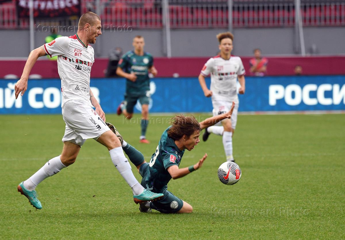 Fonbet - Russian Football Cup 2024/25. Match between the teams "Rubin" (Kazan) - "Akron" (Tolyatti) at the Ak Bars Arena stadium. Akron team player Vladimir Moskvichev (left) and Rubin team player Nikita Vasiliev (right) during the match.