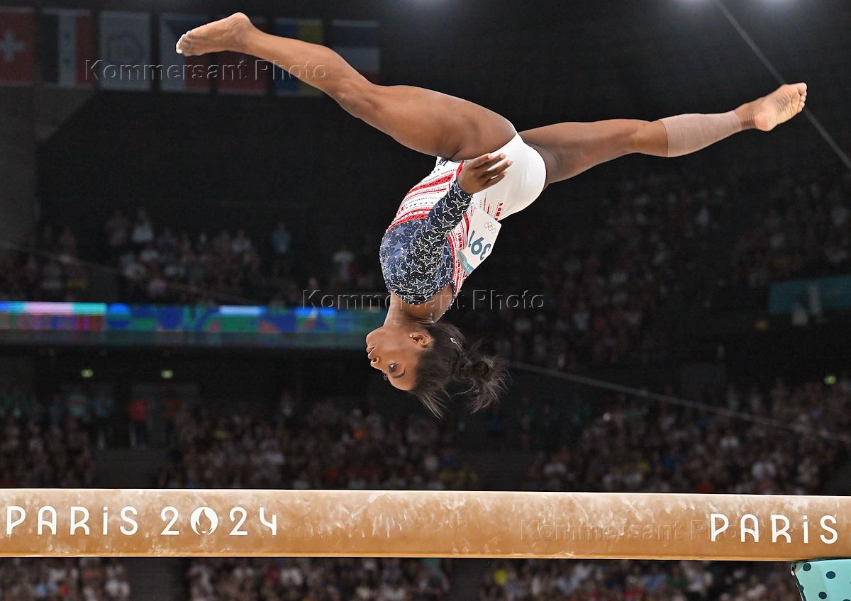 XXXIII Summer Olympic Games in Paris. Artistic gymnastics competitions at the Bercy Arena. Women's Team All-Around. The final. American gymnast Simone Biles during the competition.