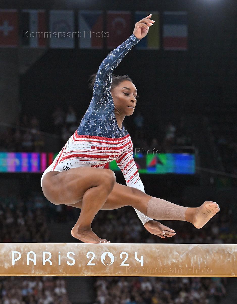 XXXIII Summer Olympic Games in Paris. Artistic gymnastics competitions at the Bercy Arena. Women's Team All-Around. The final. American gymnast Simone Biles during the competition.