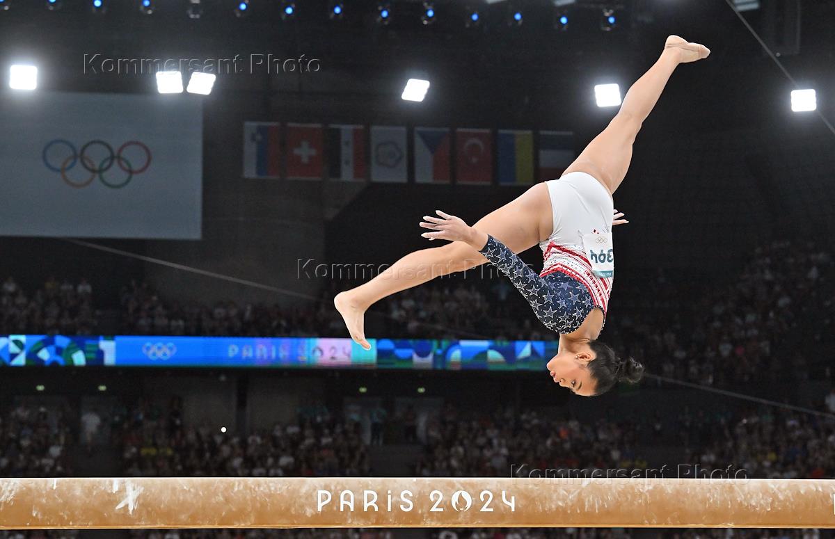 XXXIII Summer Olympic Games in Paris. Women's team all-around artistic gymnastics. Final at Arena Bercy. American gymnast Sunisa Lee during a competition.