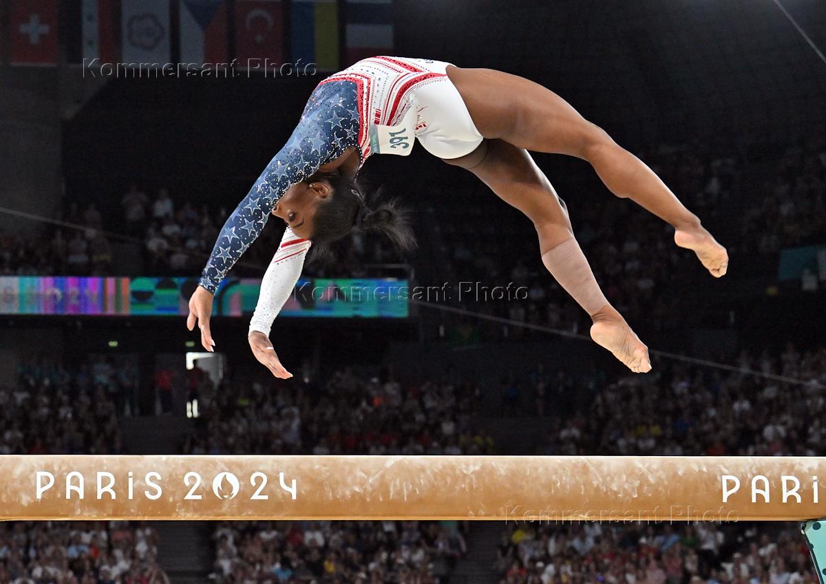 XXXIII Летние Олимпийские игры в Париже. Соревнования по спортивной гимнастике на арене "Берси". Женщины, Командное многоборье. Финал. Американская гимнастка Симона Байлз во время соревнований.