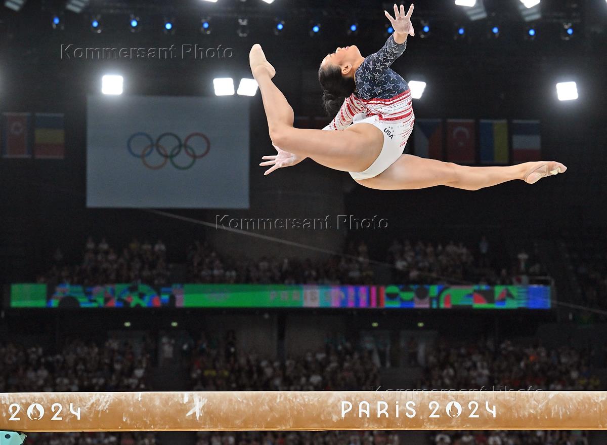 XXXIII Летние Олимпийские игры в Париже. Командное многоборье по спортивной гимнастике среди женщин. Финал на стадионе "Арена Берси". Американская гимнастка Суниса Ли во время соревнования.