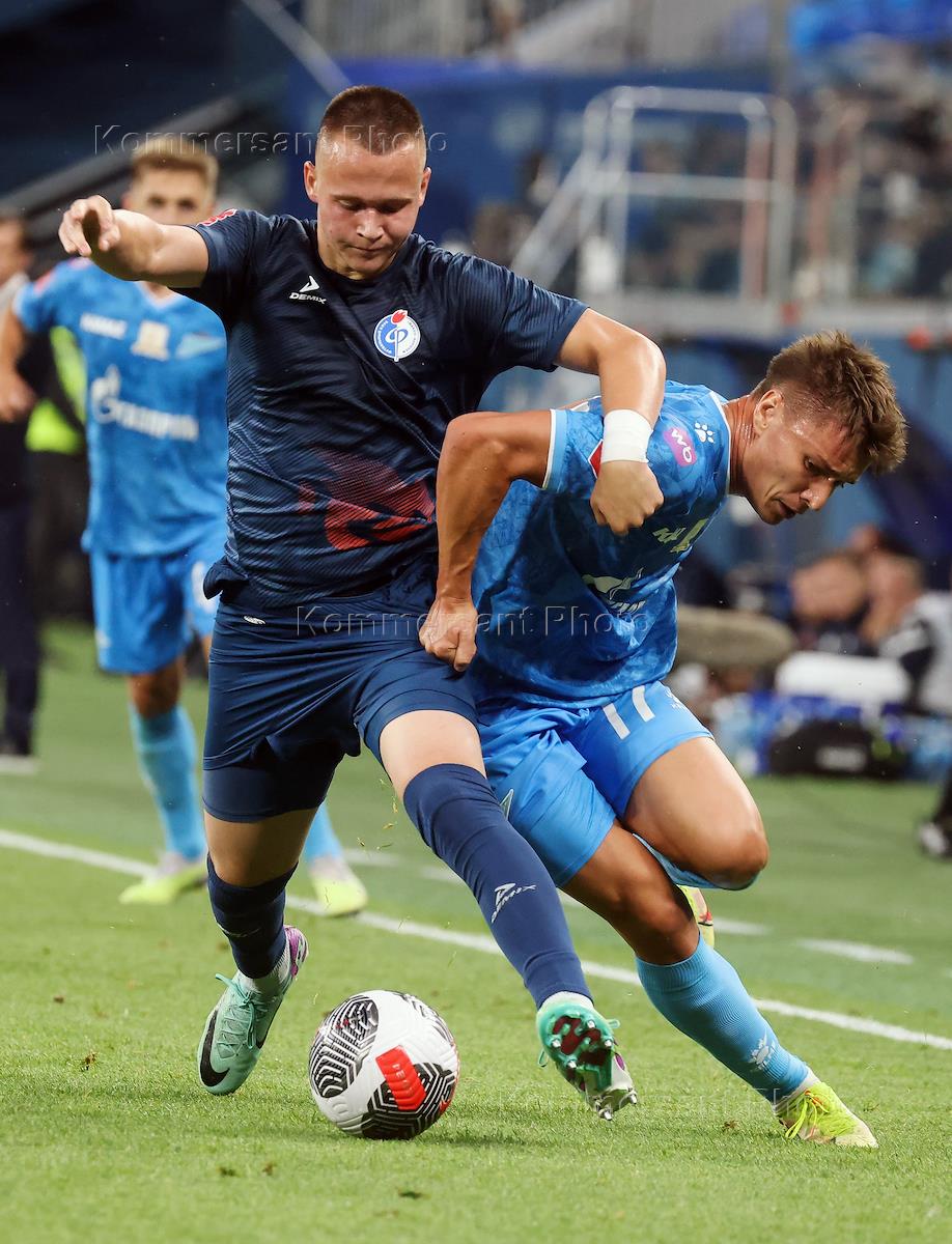 Фонбет - Кубок России по футболу 2024/25. Матч между командами "Зенит" (Санкт-Петербург) - "Факел" (Воронеж) на стадионе "Газпром Арена". Игрок команды "Зенит" Густаво Мантуан (справа) и игрок команды "Факел" Макс Дзиов (слева) во время матча.