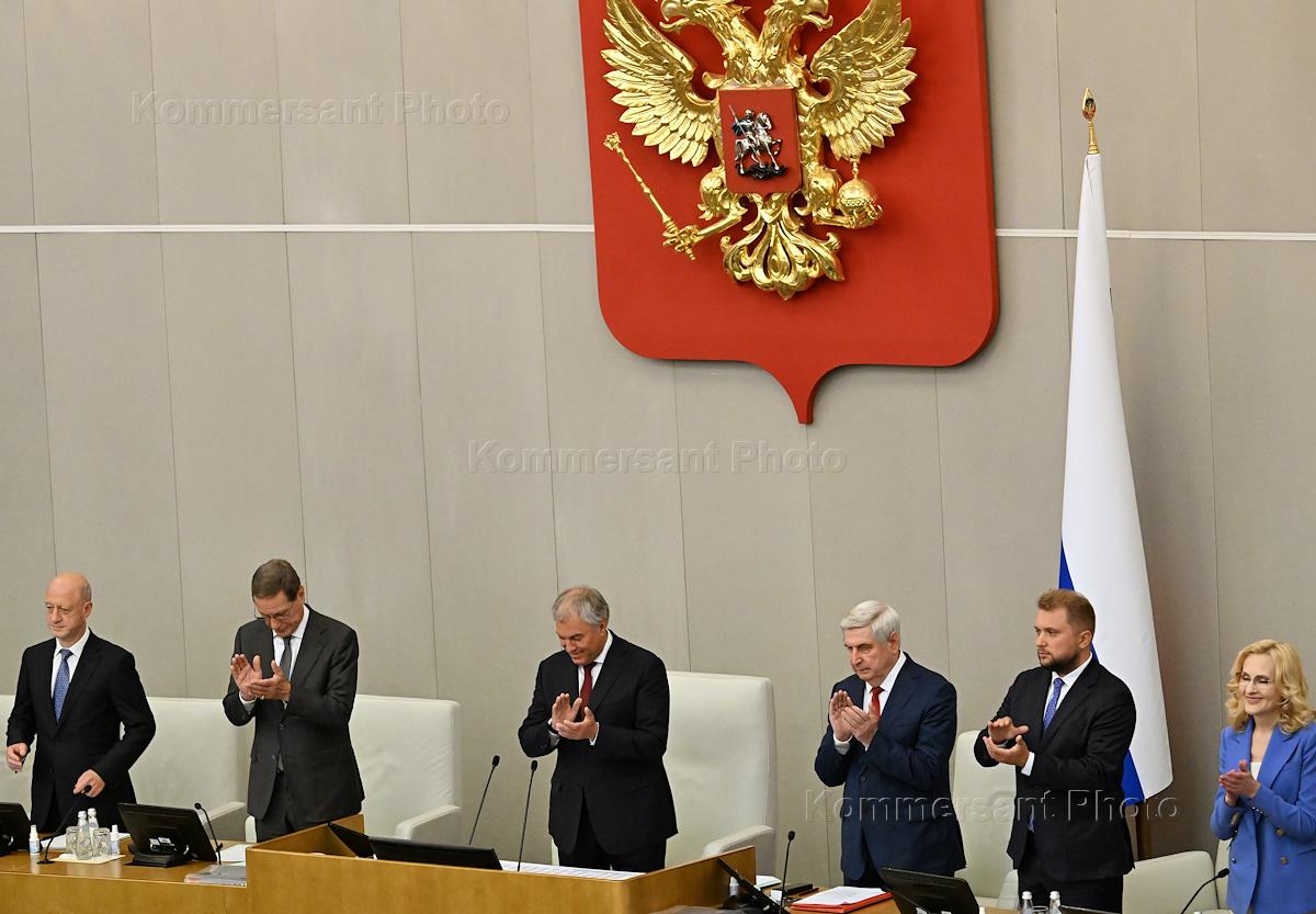 The final plenary meeting of the spring session of the State Duma of Russia. Deputies of the State Duma of Russia during the performance of the Russian anthem before the start of the meeting.