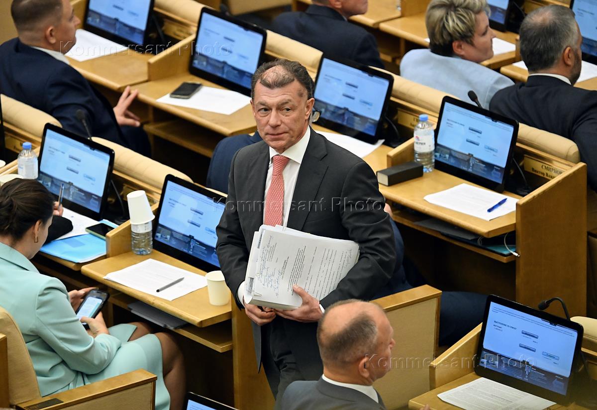 Заключительное пленарное заседание весенней сессии Государственной думы (ГД) России. Первый заместитель председателя комитета ГД России по промышленности и торговле Александр Козловский (в центре) во время заседания.