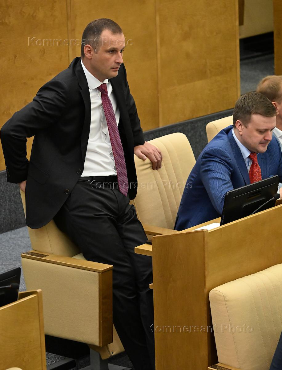 Заключительное пленарное заседание весенней сессии Государственной думы (ГД) России. Заместитель председателя комитета ГД России по охране здоровья Сергей Леонов (слева) и председатель комитета ГД России по региональной политике и местному самоуправлению Алексей Диденко (справа) во время заседания.
