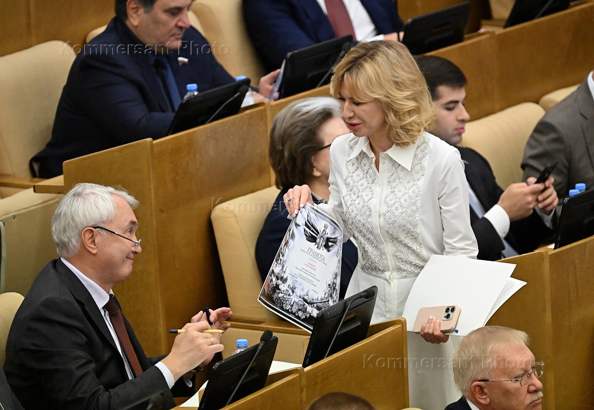 The final plenary meeting of the spring session of the State Duma of Russia. Chairman of the Russian State Duma Committee on Defense Andrei Kartapolov (left) and member of the Russian State Duma Committee on Labor, Social Policy and Veterans Affairs Ekaterina Stenyakina (center) during the meeting.
