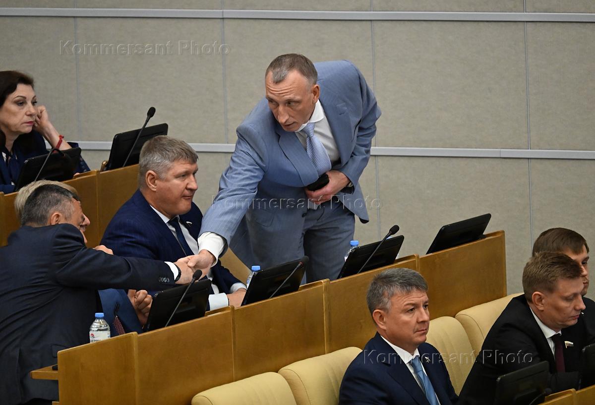 Заключительное пленарное заседание весенней сессии Государственной думы (ГД) России. Член комитета ГД России по аграрным вопросам Алексей Лавриненко (справа) во время заседания.
