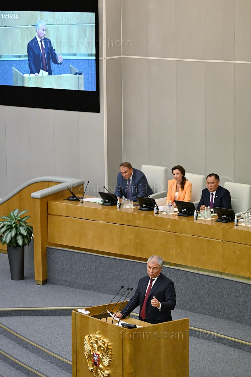 Заключительное пленарное заседание весенней сессии Государственной думы (ГД) России. Председатель ГД России Вячеслав Володин (в центре) во время заседания.