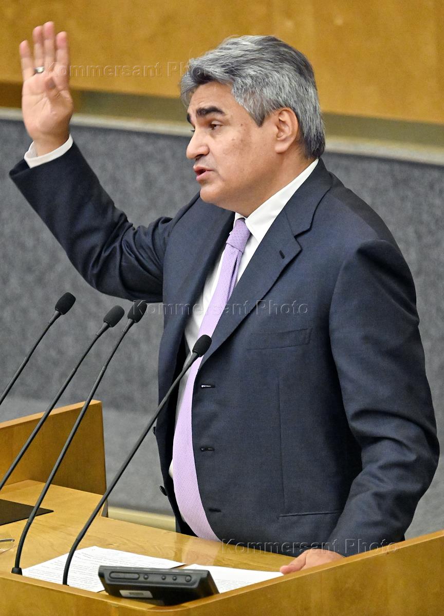 Заключительное пленарное заседание весенней сессии Государственной думы (ГД) России. Слева направо: член комитета ГД России по транспорту и строительству Мурад Гаджиев, член комитета ГД России по экологии, природным ресурсам и охране окружающей среды Азат Ягафаров и заместитель председателя комитета ГД России по вопросам собственности, земельным и имущественным отношениям Николай Николаев во время заседания.