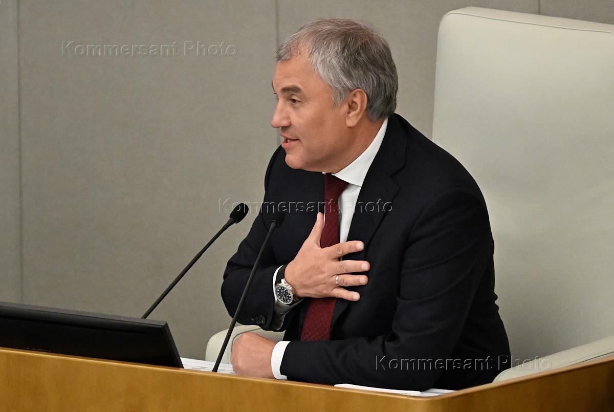 The final plenary meeting of the spring session of the State Duma of Russia. Chairman of the State Duma of Russia Vyacheslav Volodin (right) during the meeting.