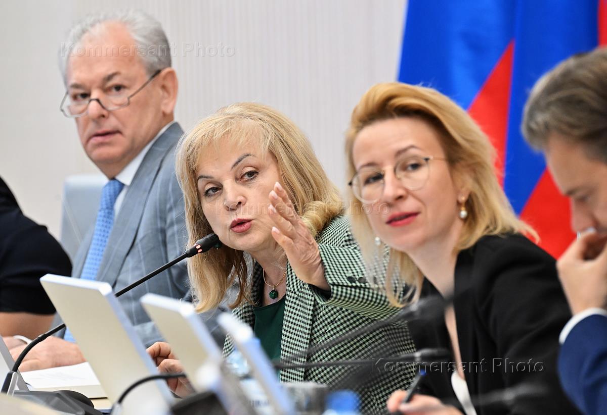 Meeting of the Central Election Commission (CEC) of Russia. From left to right: Deputy Chairman of the Central Election Commission of Russia Nikolai Bulaev, Chairman of the Central Election Commission of Russia Ella Pamfilova and Secretary of the Central Election Commission of Russia Natalya Budarina during the meeting.